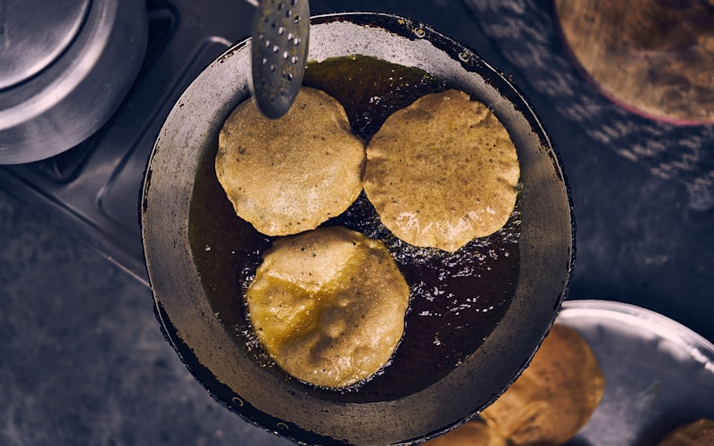 A Bahian street food icon. Black-eyed pea fritters deep-fried in dendê (palm oil), split open and stuffed with vatapá (a creamy paste of shrimp, peanuts, and coconut), caruru (okra stew), and dried shrimp. Rich, flavorful, and deeply connected to Afro-Brazilian Candomblé traditions.